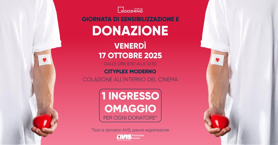 💝 Per ringraziarvi ogni donatore riceverà 2 biglietti omaggio, utilizzabili per assistere a uno spettacolo al Cityplex Moderno. Un piccolo regalo per offrirvi l’opportunità di trascorrere una serata piacevole al cinema, magari in compagnia di chi ci è caro.
